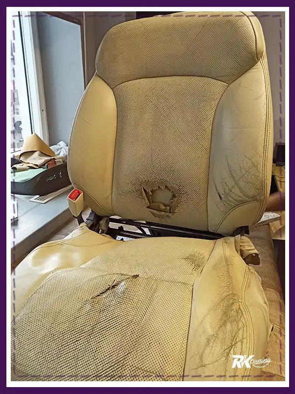 Эти и другие локальные дефекты (морщины, разрывы) можно устранить реставрацией, не прибегая к полному перешиву чехлов.
